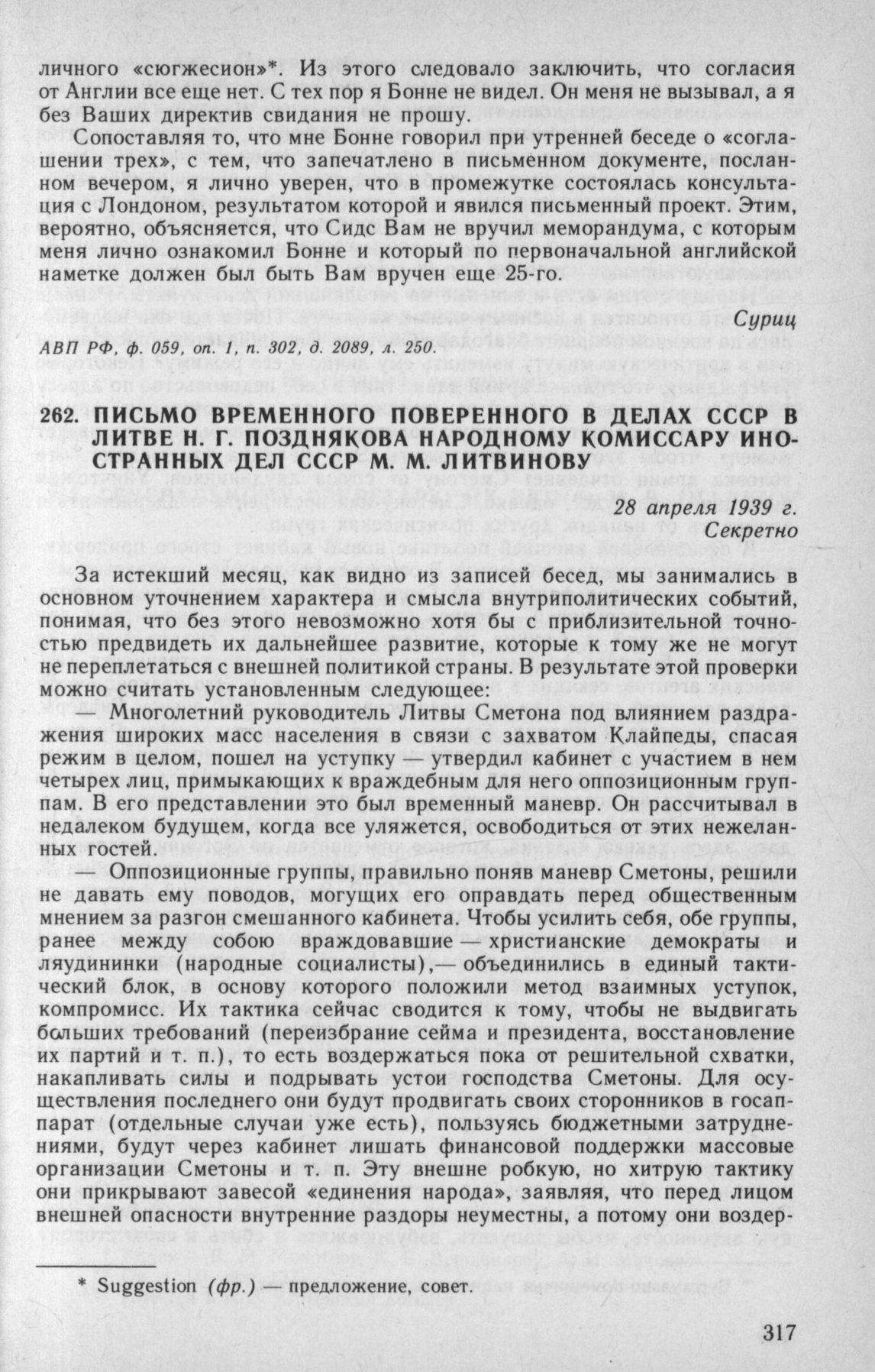 Письмо временного поверенного в делах СССР в Литве Н. Г. Позднякова народному комиссару иностранных дел СССР М. М. Литвинову. 28 апреля 1939 г. // АВП РФ, ф. 011, oп. 4. п. 29, д. 112, л. 81—83.