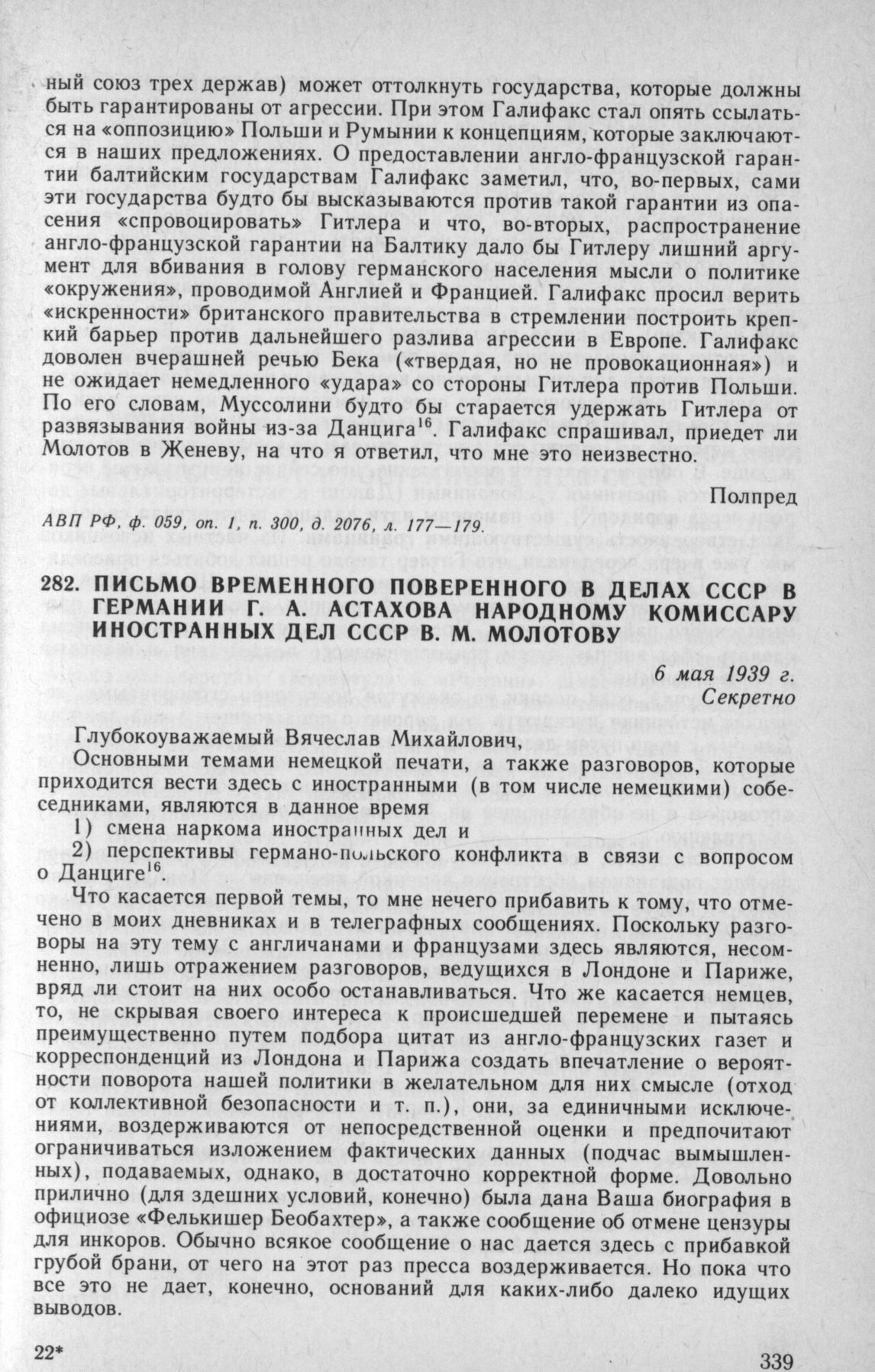 Письмо временного поверенного в делах СССР в Германии Г. А. Астахова народному комиссару иностранных дел СССР В. М. Молотову. 6 мая 1939 г. // АВП РФ, ф. 06, oп. 1, п. 7, д. 66, л. 21—24.