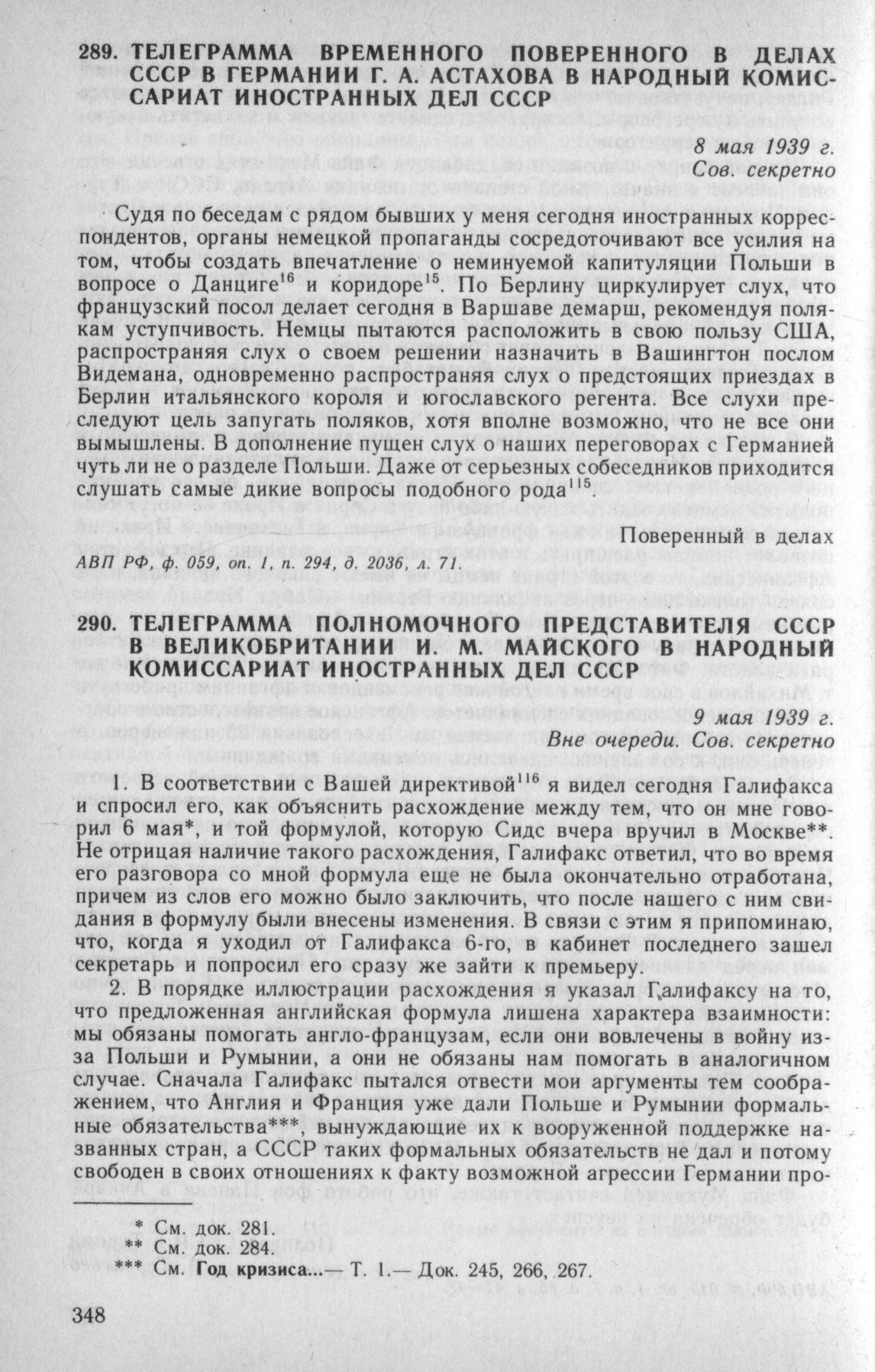 Телеграмма временного поверенного в делах СССР в Германии Г. А. Астахова в Народный комиссариат иностранных дел СССР. 8 мая 1939 г. // АВП РФ, ф. 059, oп. 1. п. 294, д. 2036. л. 71.