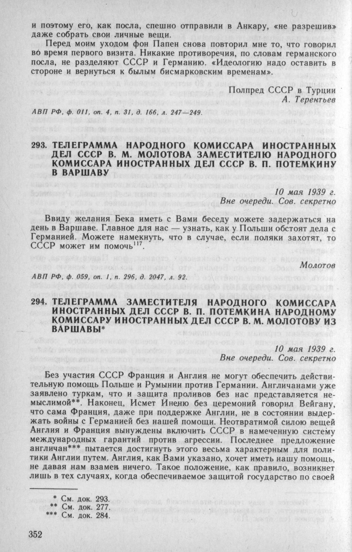 Телеграмма заместителя народного комиссара иностранных дел СССР В. П. Потемкина народному комиссару иностранных дел СССР В. М. Молотову из Варшавы. 10 мая 1939 г. // АВП РФ, ф. 059, oп. 1, п. 296, д. 2046, л. 122—125.
