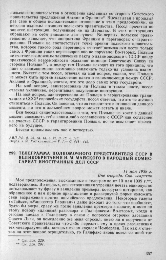 Телеграмма полномочного представителя СССР в Великобритании И. М. Майского в Народный комиссариат иностранных дел СССР. 11 мая 1939 г. // АВП РФ, ф. 059, oп. 1, п. 300, д. 2076, л. 192—193.