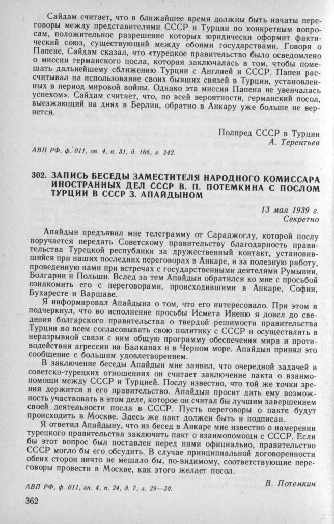 Запись беседы заместителя народного комиссара иностранных дел СССР В. П. Потемкина с послом Турции в СССР 3. Апайдыном. 13 мая 1939 г. // АВП РФ, ф. 011, oп. 4, п. 24, д. 7, л. 29—30.