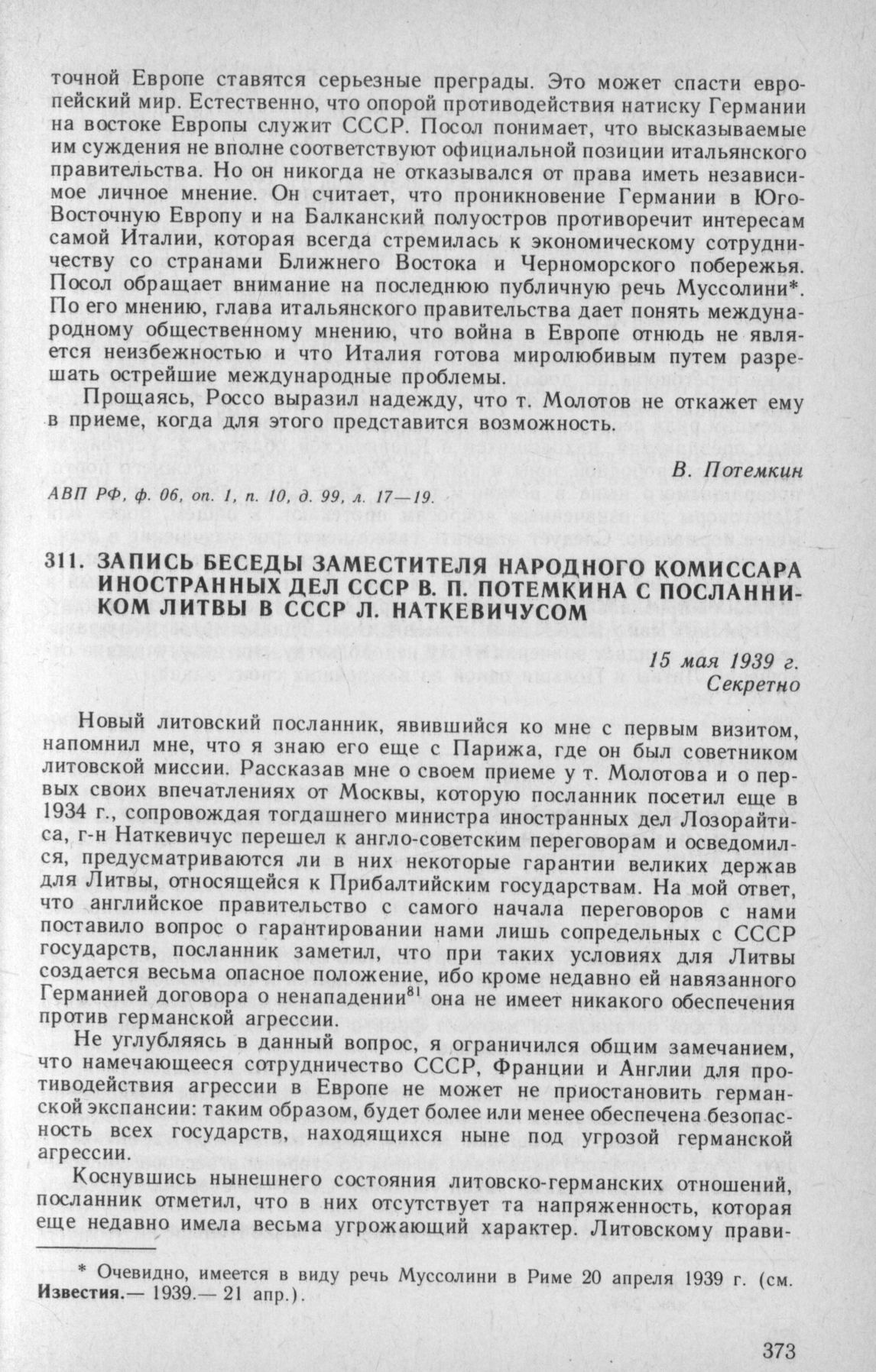Запись беседы заместителя народного комиссара иностранных дел СССР В. П. Потемкина с посланником Литвы в СССР Л. Наткевичиусом. 15 мая 1939 г. // АВП РФ, ф. 011, oп. 4, п. 24, д. 7, л. 36—38.