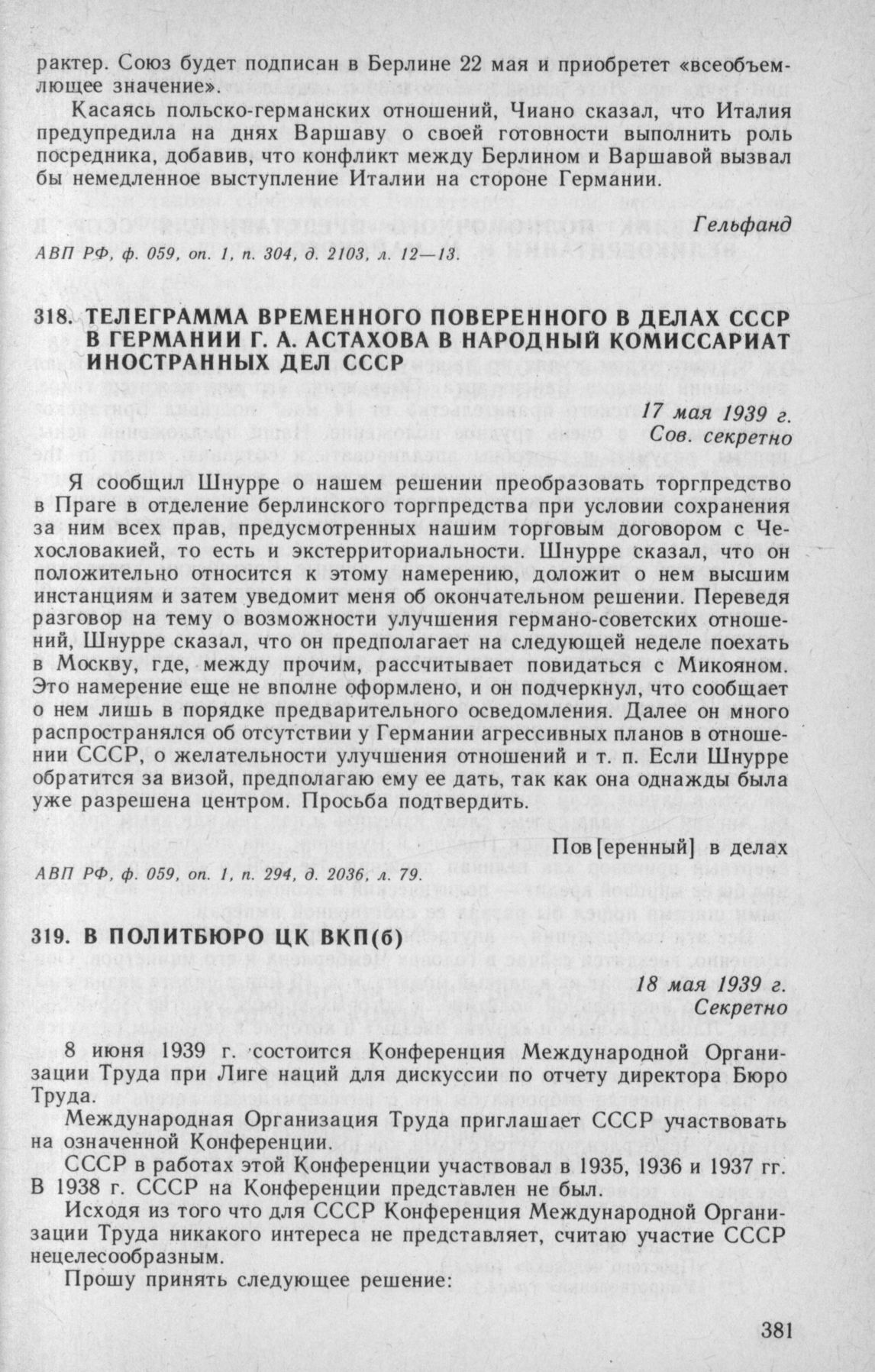 Телеграмма временного поверенного в делах СССР в Германии Г. А. Астахова в Народный комиссариат иностранных дел СССР. 17 мая 1939 г. // АВП РФ, ф. 059, oп. 1. п. 294, д. 2036, л. 79.