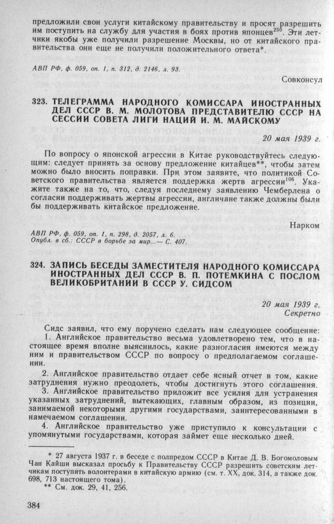 Телеграмма народного комиссара иностранных дел СССР В. М. Молотова представителю СССР на сессии Совета Лиги наций И. М. Майскому. 20 мая 1939 г. // АВП РФ, ф. 059, oп. 1, п. 298, д. 2057, л. 6.; СССР в борьбе за мир...— С. 407.