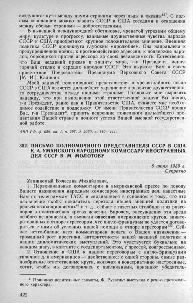 Письмо полномочного представителя СССР в США К. А. Уманского народному комиссару иностранных дел СССР В. М. Молотову. 6 июня 1939 г. // АВП РФ, ф. 06, oп. 1. п. 15. д. 158, л. 155—162.