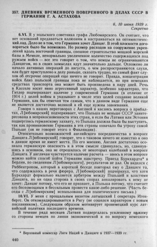 Дневник временного поверенного в делах СССР в Германии Г. А. Астахова. 6, 10 июня 1939 г. // АВП РФ, ф. 011, oп. 4, п. 27, д. 59, л. 111—114.