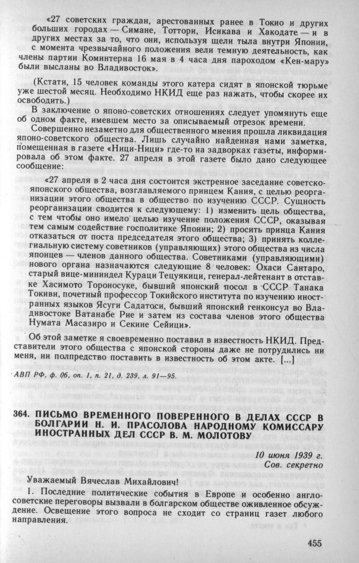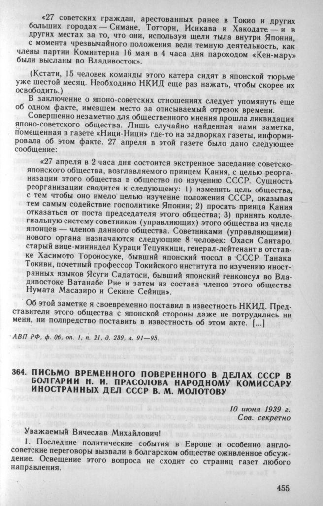 Письмо временного поверенного в делах СССР в Болгарии Н. И. Прасслова народному комиссару иностранных дел СССР В. М. Молотову. 10 июня 1939 г. // АВП РФ, ф. 011, oп. 4, п. 27, д. 49, л. 29—34.
