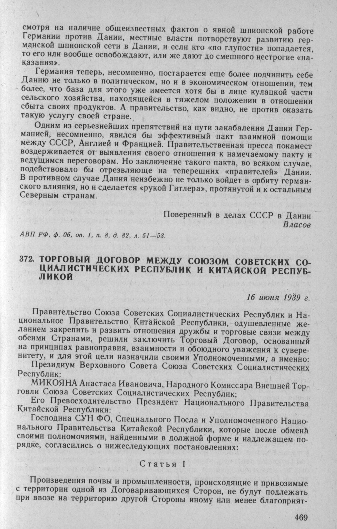 Торговый Договор между Союзом Советских Социалистических Республик и Китайской Республикой. 16 июня 1939 г. // АВП РФ, ф. 3-а Китай, д. 63.; Сборник Торговых договоров СССР, М. 1941. С. 242—252.