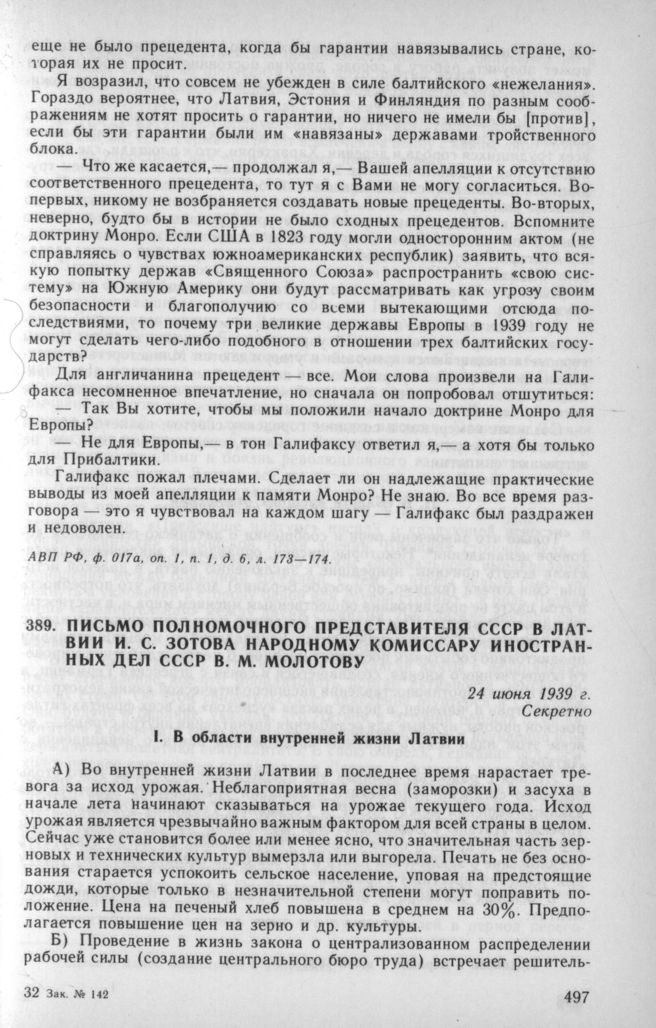 Письмо полномочного представителя СССР в Латвии И. С. Зотова народному комиссару иностранных дел СССР В. М. Молотову. 24 июня 1939 г. // АВП РФ, ф. 011, oп. 4, п. 29, д. 102, л. 32—37.