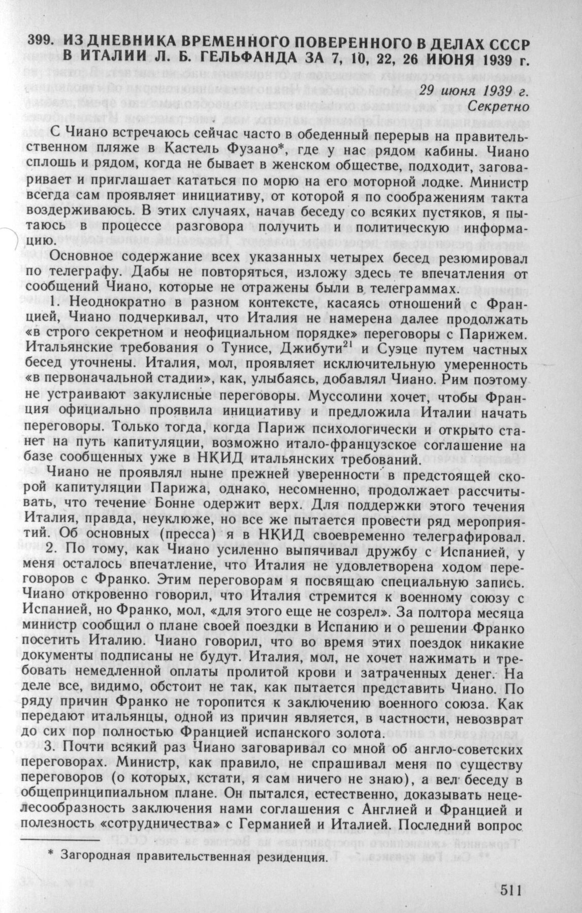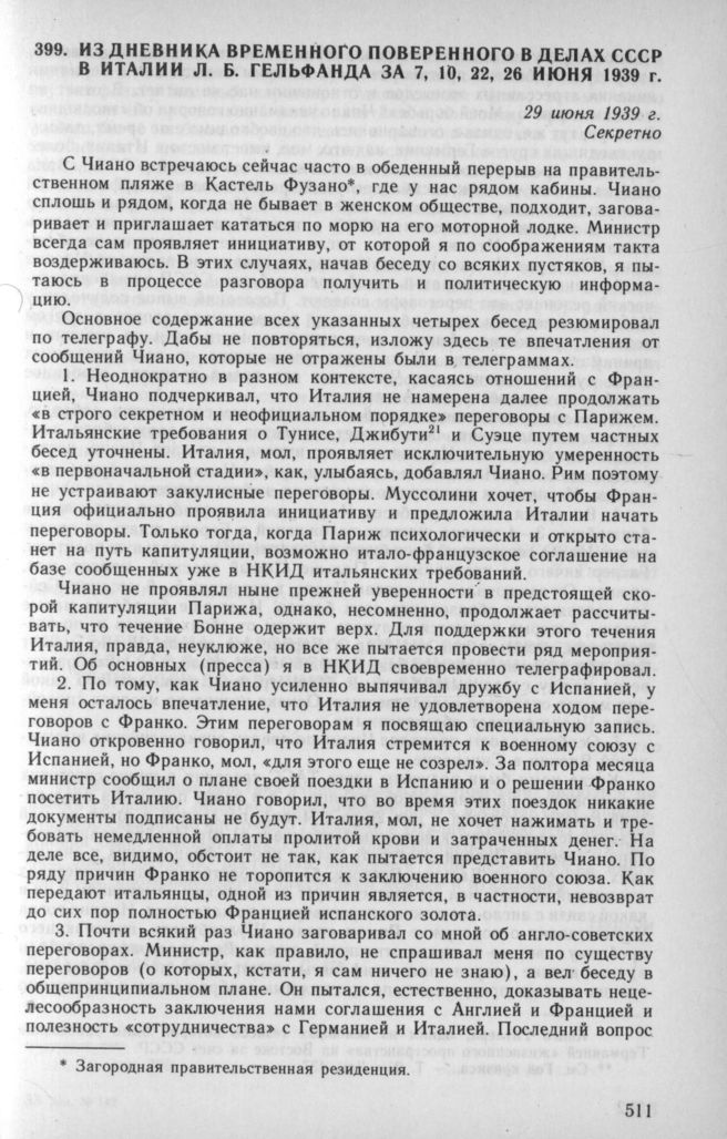 Из дневника временного поверенного в делах СССР в Италии Л. Б. Гельфанда за 7, 10, 22, 26 июня 1939 г. 29 июня 1939 г. // АВП РФ, ф. 011, oп. 4, п. 28, д. 90, л. 44—47.