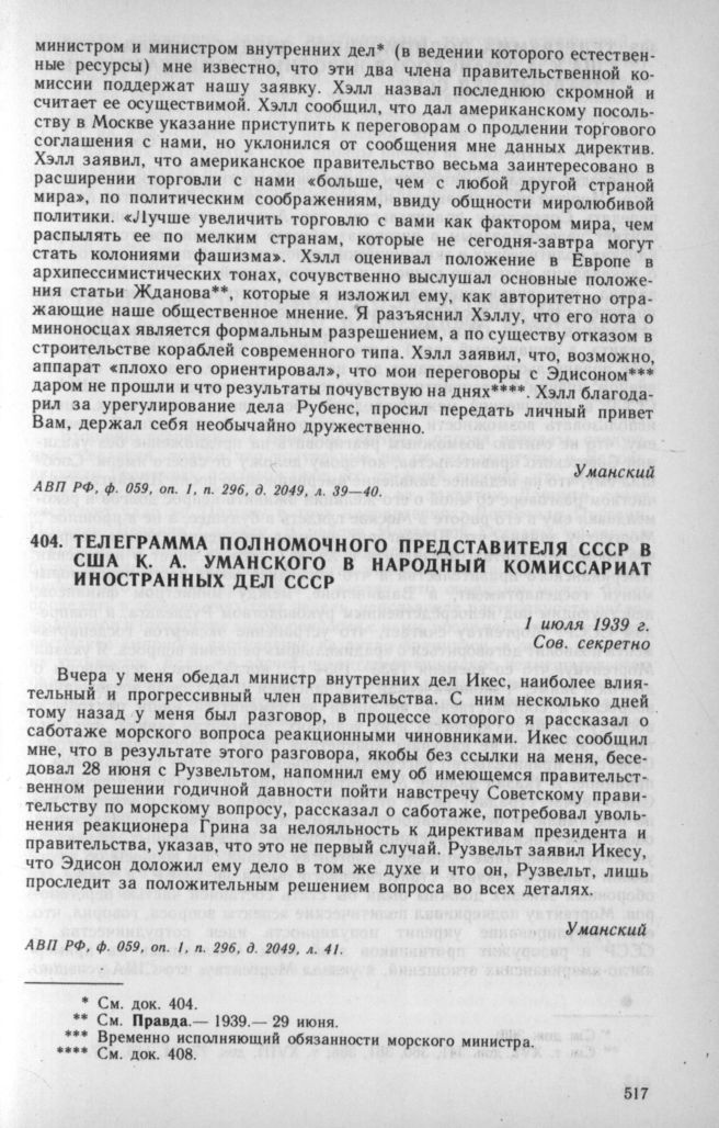 Телеграмма полномочного представителя СССР в США К. А. Уманского в Народный комиссариат иностранных дел СССР. 1 июля 1939 г. // АВП РФ, ф. 059, oп. 1, п. 296, д. 2049, л. 41.