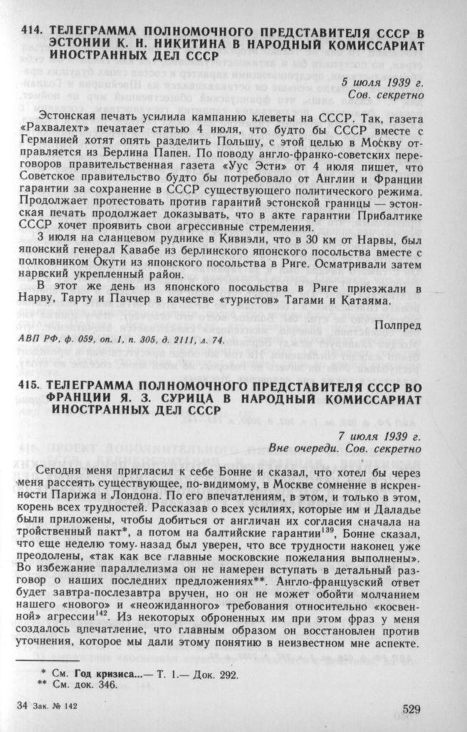 Телеграмма полномочного представителя СССР в Эстонии К. Н. Никитина в Народный комиссариат иностранных дел СССР. 5 июля 1939 г. // АВП РФ, ф. 059, oп. 1, п. 305, д. 2111, л. 74.