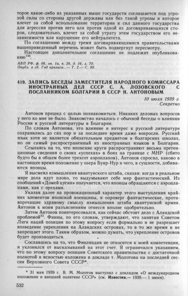 Запись беседы заместителя народного комиссара иностранных дел СССР С. А. Лозовского с посланником Болгарии в СССР Н. Антоновым. 10 июля 1939 г. // АВП РФ, ф. 013а, oп. 1, п. 1, д. 3, л. 50—52.