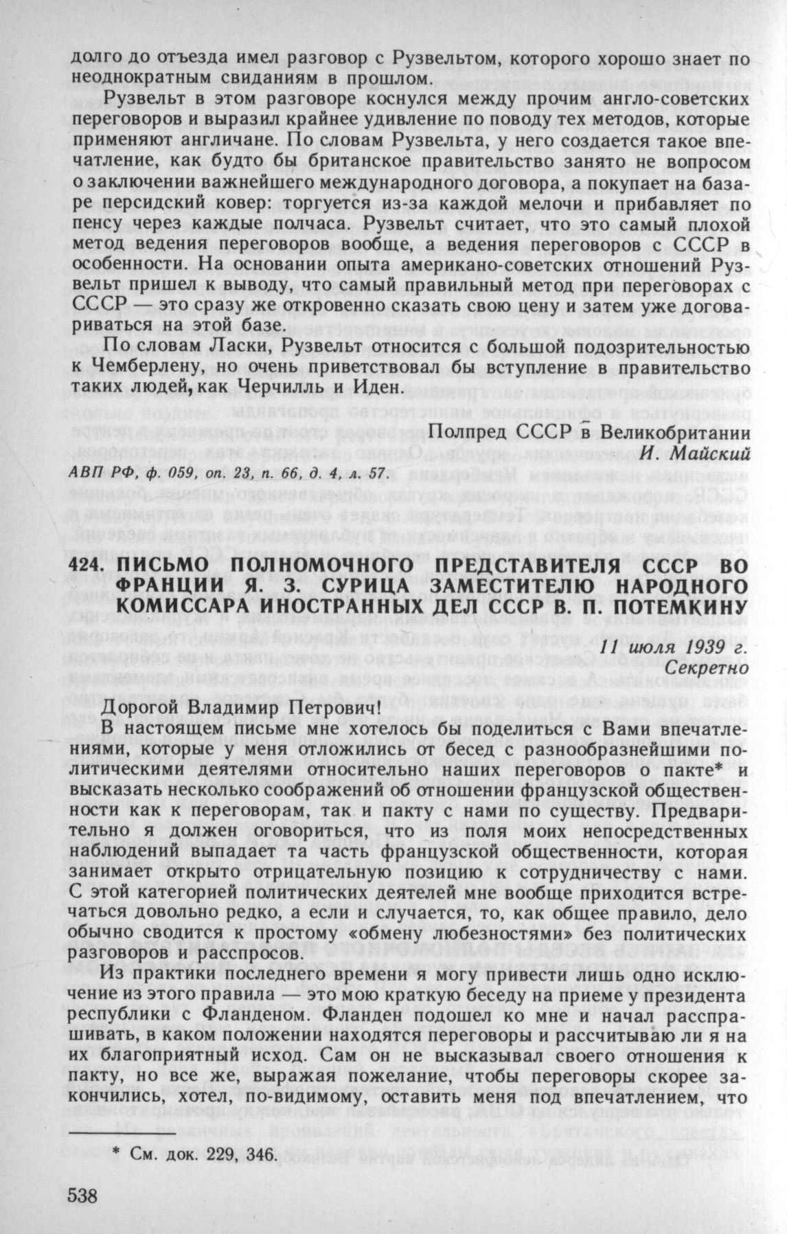 Письмо полномочного представителя СССР во Франции Я. 3. Сурица заместителю народного комиссара иностранных дел СССР В. П. Потемкину. 11 июля 1939 г. // АВП РФ, ф. 06. oп. 1. п. 13. д. 208, л. 1—8.