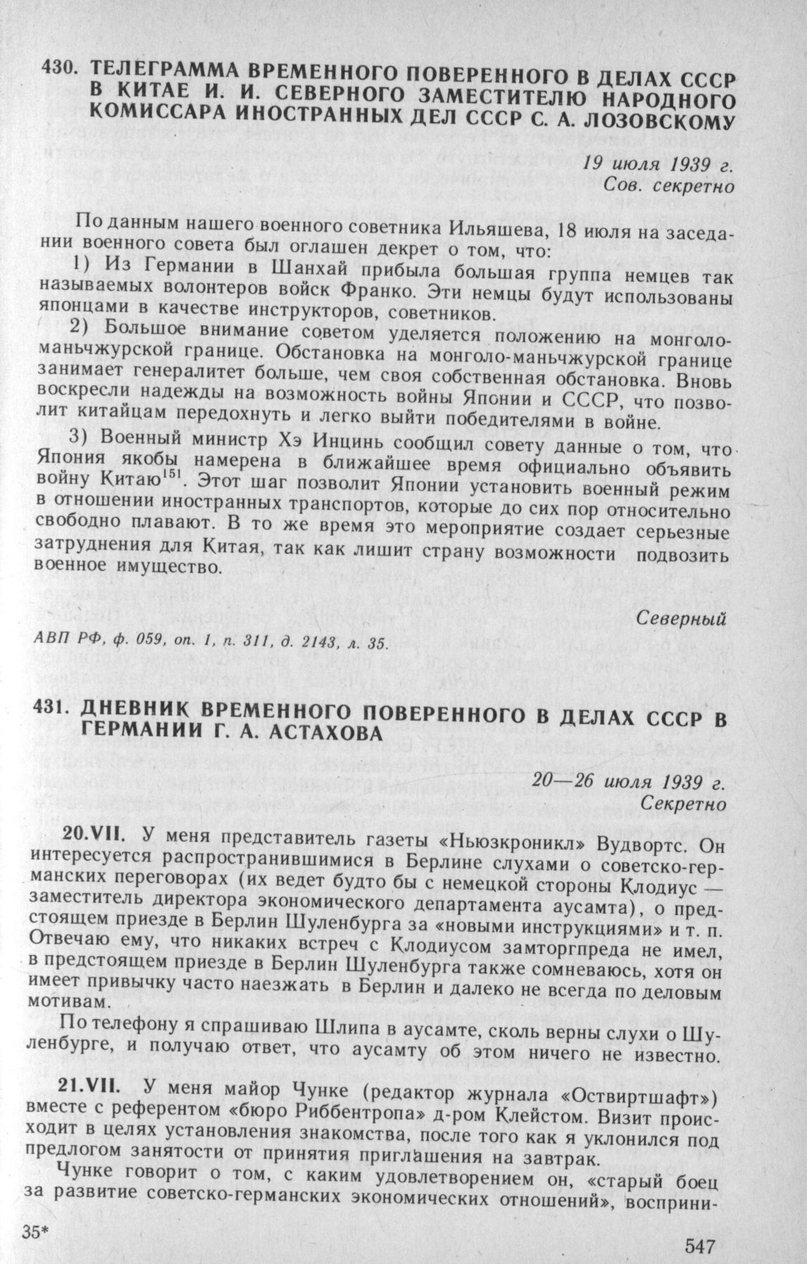 Телеграмма временного поверенного в делах СССР в Китае И. И. Северного заместителю народного комиссара иностранных дел СССР С. А. Лозовскому. 19 июля 1939 г. // АВП РФ, ф. 059, oп. 1, п. 311, д. 2143, л. 35.