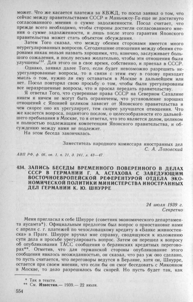 Запись беседы временного поверенного в делах СССР в Германии Г. А. Астахова с заведующим восточноевропейской референтурой Отдела экономической политики Министерства иностранных дел Германии К. Ю. Шнурре. 24 июля 1939 г. // АВП РФ, ф. 082, oп. 22, п. 93. д. 8, л. 115—117.; Год кризиса...— Т. 2.— С. 120—122.