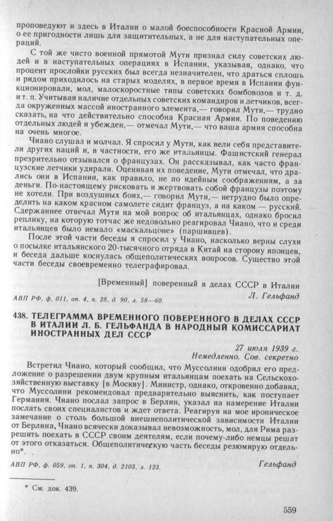 Телеграмма временного поверенного в делах СССР в Италии Л. Б. Гельфанда в Народный комиссариат иностранных дел СССР. 27 июля 1939 г. // АВП РФ, ф. 059, oп. 1, п. 304, д. 2103, л. 123.