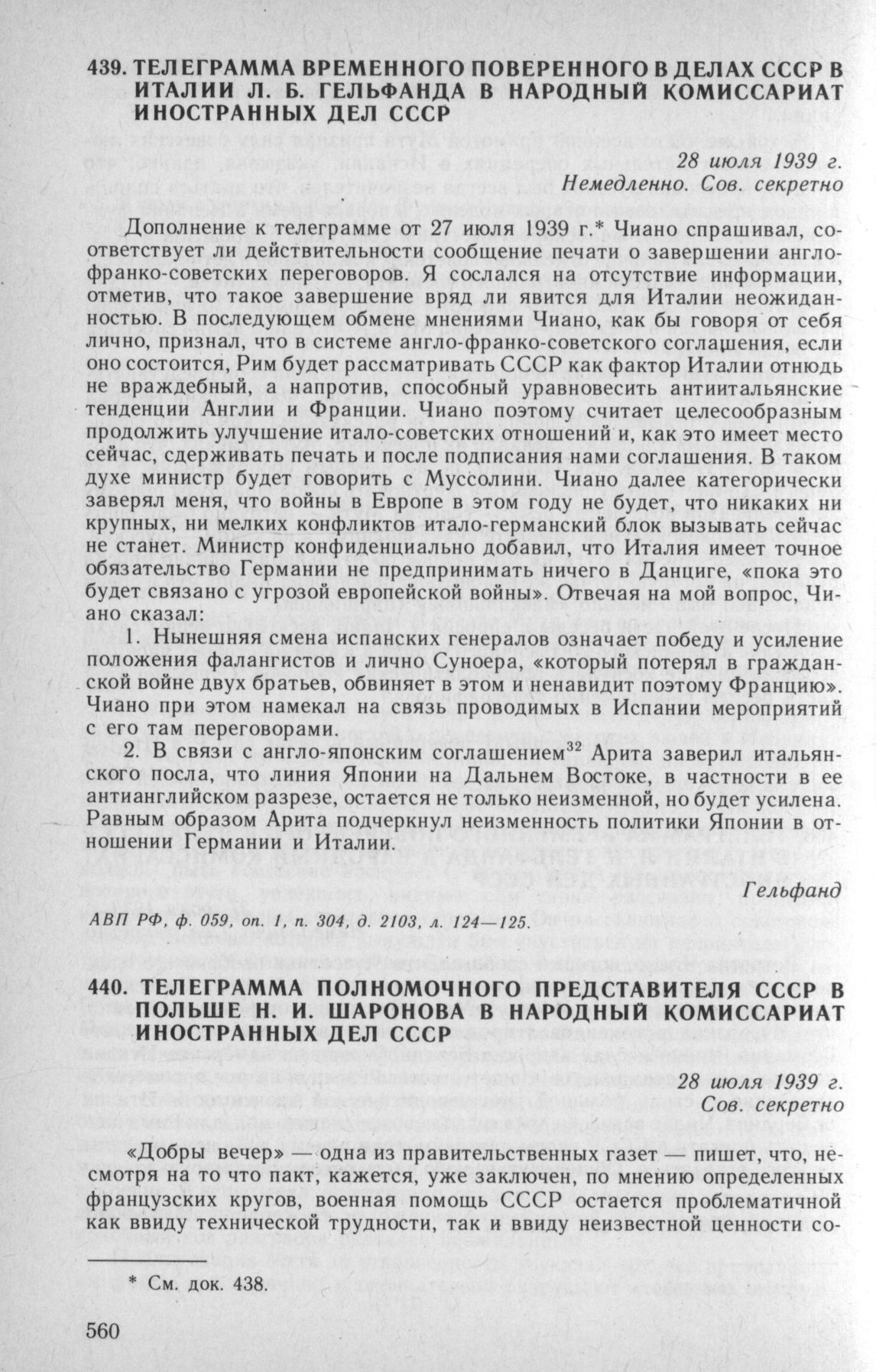 Телеграмма временного поверенного в делах СССР в Италии Л. Б. Гельфанда в Народный комиссариат иностранных дел СССР. 28 июля 1939 г. // АВП РФ, ф. 059, oп. 1, п. 304, д. 2103, л. 124—125.