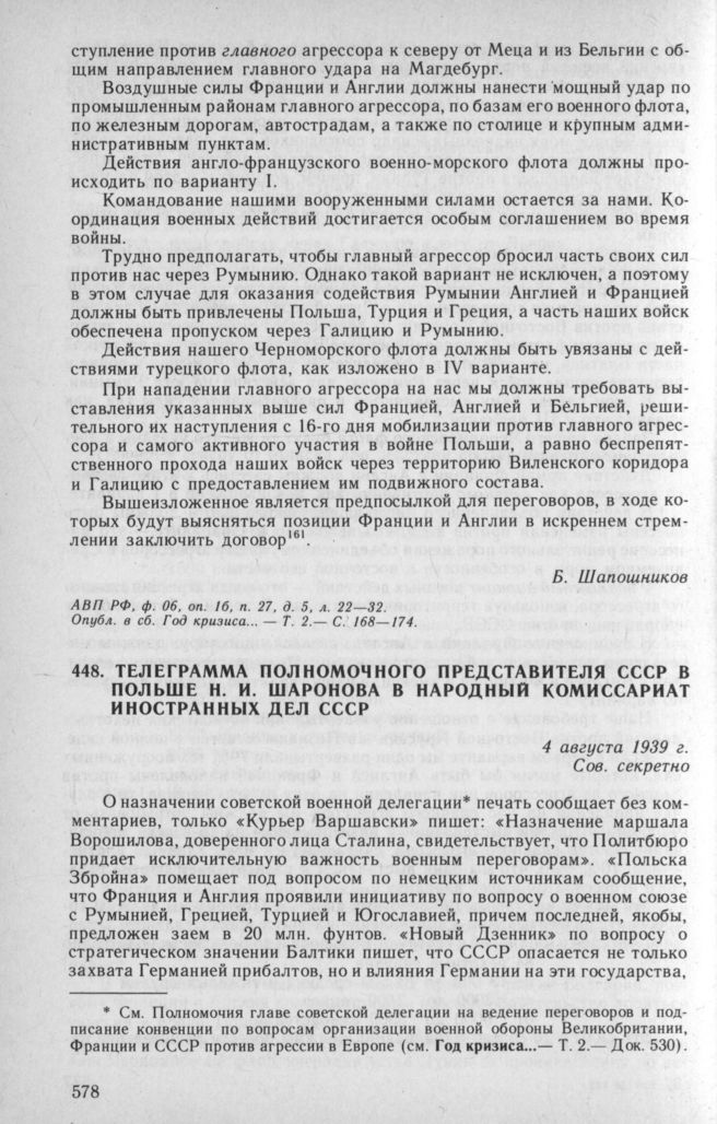 Телеграмма полномочного представителя СССР в Польше Н. И. Шаронова в Народный комиссариат иностранных дел СССР. 4 августа 1939 г. // АВП РФ, ф. 059. oп. 1. п. 296. д. 2046, л. 210—211.