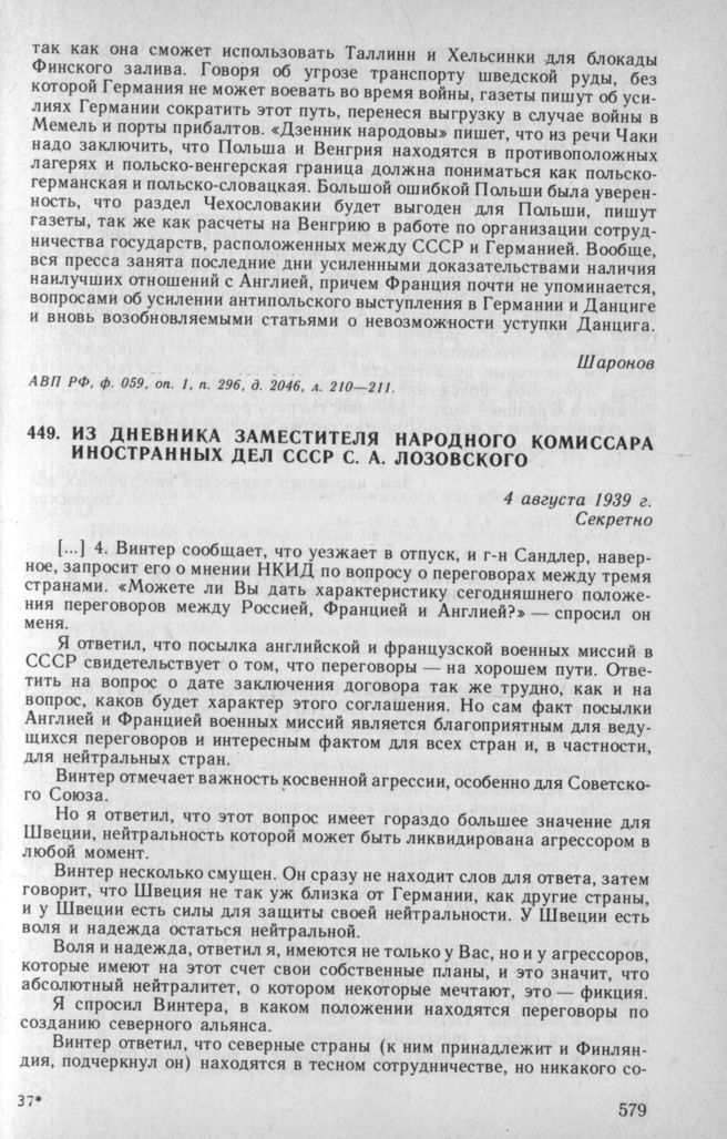 Из дневника заместителя народного комиссара иностранных дел СССР С. А. Лозовского. 4 августа 1939 г. // АВП РФ, ф. 013а, oп. 1, п. 1, д. 3, л. 91—93.