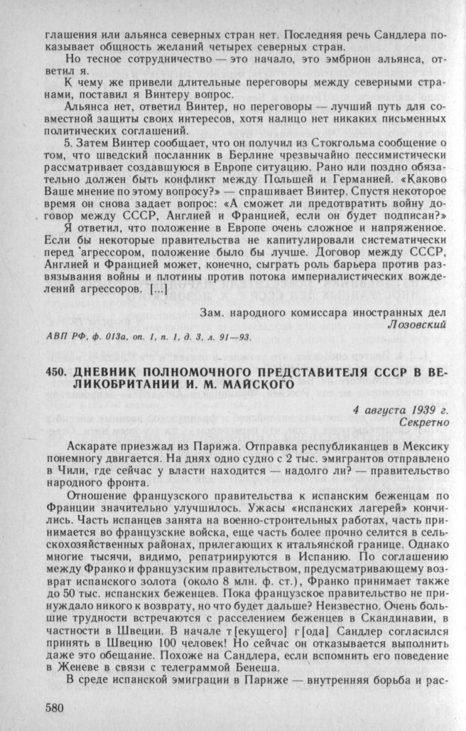 Дневник полномочного представителя СССР в Великобритании И. М. Майского. 4 августа 1939 г. // АВП РФ, ф. 017а, oп. 1, п. 1, д. 6, л. 206—208.