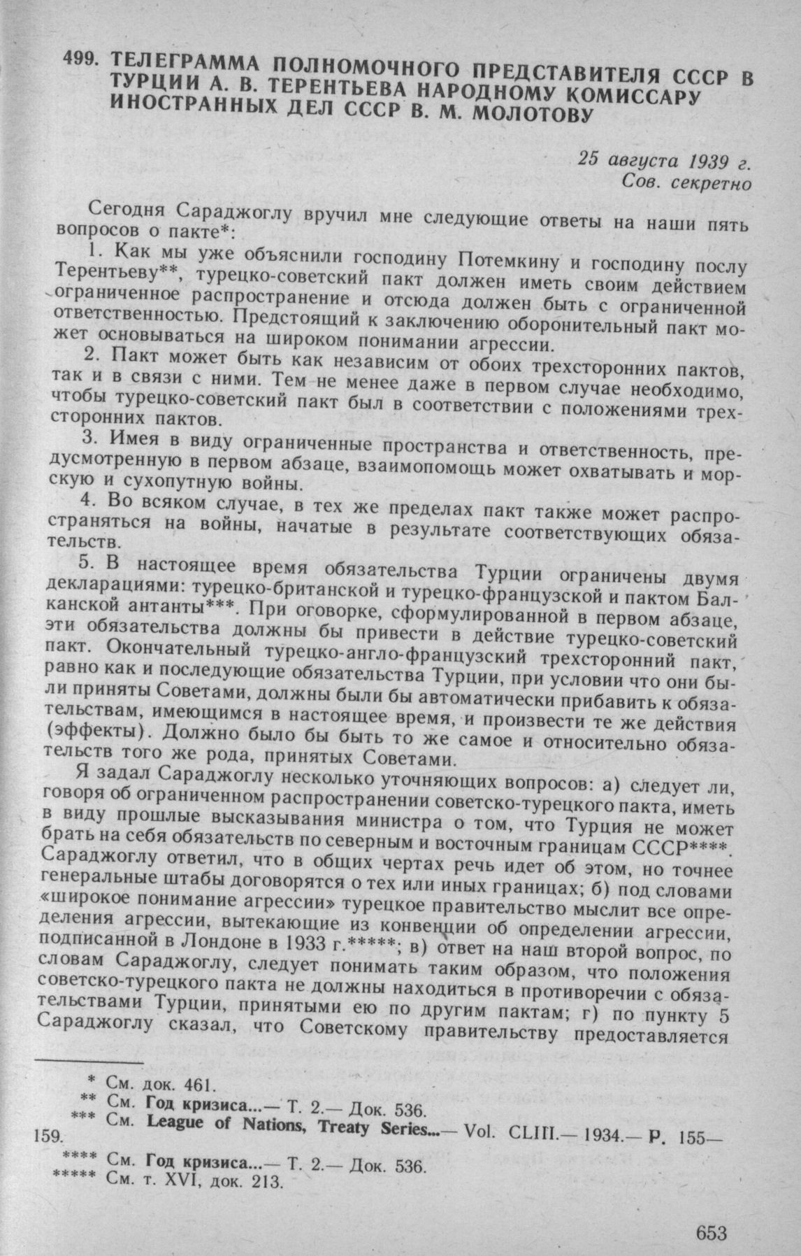 Главная Документы внешней политики СССР Документы внешней политики СССР. Т. XXII. 1939. В 2 кн. Кн. 1. Янва... Телеграмма полномочного представителя СССР в Турции А. В. Терентьев...