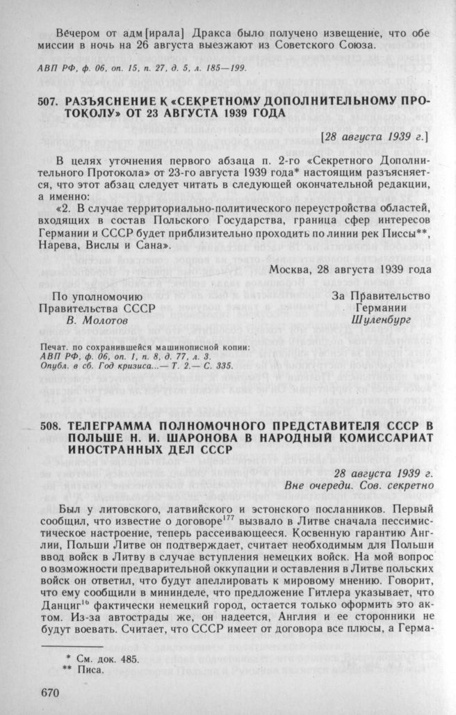 Телеграмма полномочного представителя СССР в Польше Н. И. Шаронова в Народный комиссариат иностранных дел СССР. 28 августа 1939 г. // АВП РФ, ф. 059, oп. 1, п. 296, д. 2046, л. 255—256.