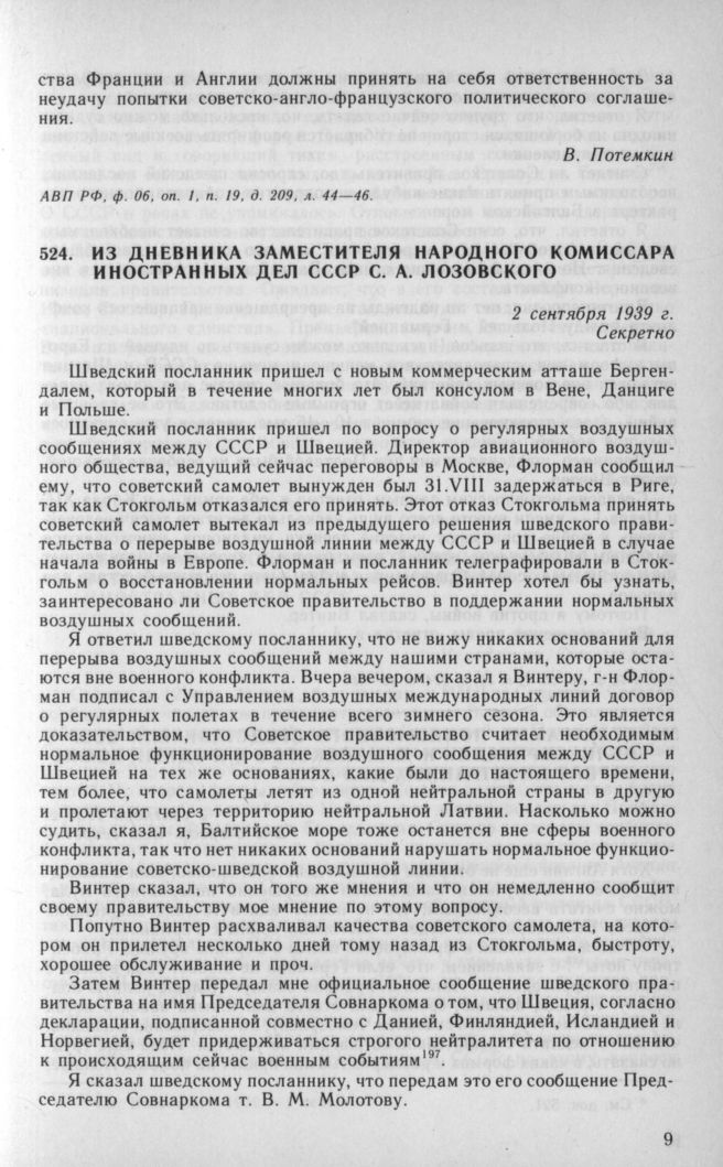 Из дневника заместителя народного комиссара иностранных дел СССР С. А. Лозовского. 2 сентября 1939 г. // АВП РФ, ф. 06, oп. 1, п. 20, д. 224, л. 18—20.