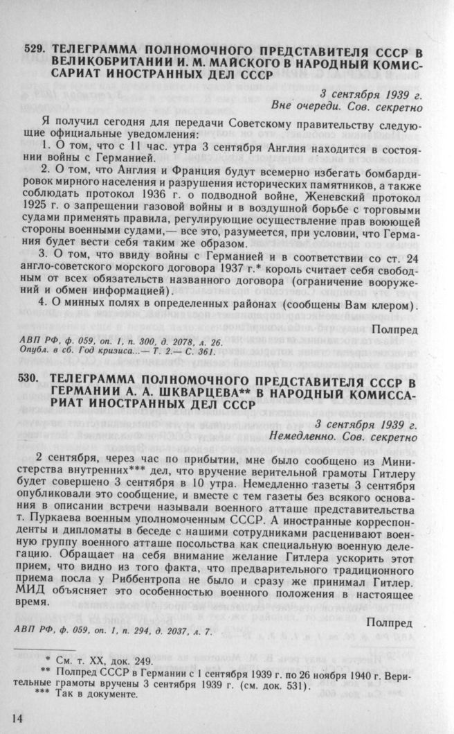 Телеграмма полномочного представителя СССР в Великобритании И. М. Майского в Народный комиссариат иностранных дел СССР. 3 сентября 1939 г. // АВП РФ, ф. 059, oп. 1, п. 300, д. 2078, л. 26.; Год кризиса...— Т. 2.— С. 361.