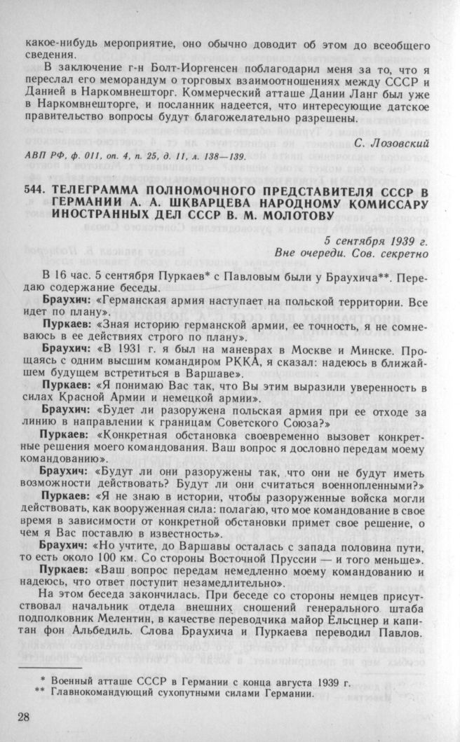 Телеграмма полномочного представителя СССР в Германии А. А. Шкварцева народному комиссару иностранных дел СССР В. М. Молотову. 5 сентября 1939 г. // АВП РФ, ф. 059, oп. 1, п. 924, д. 2037, л. 19—20.