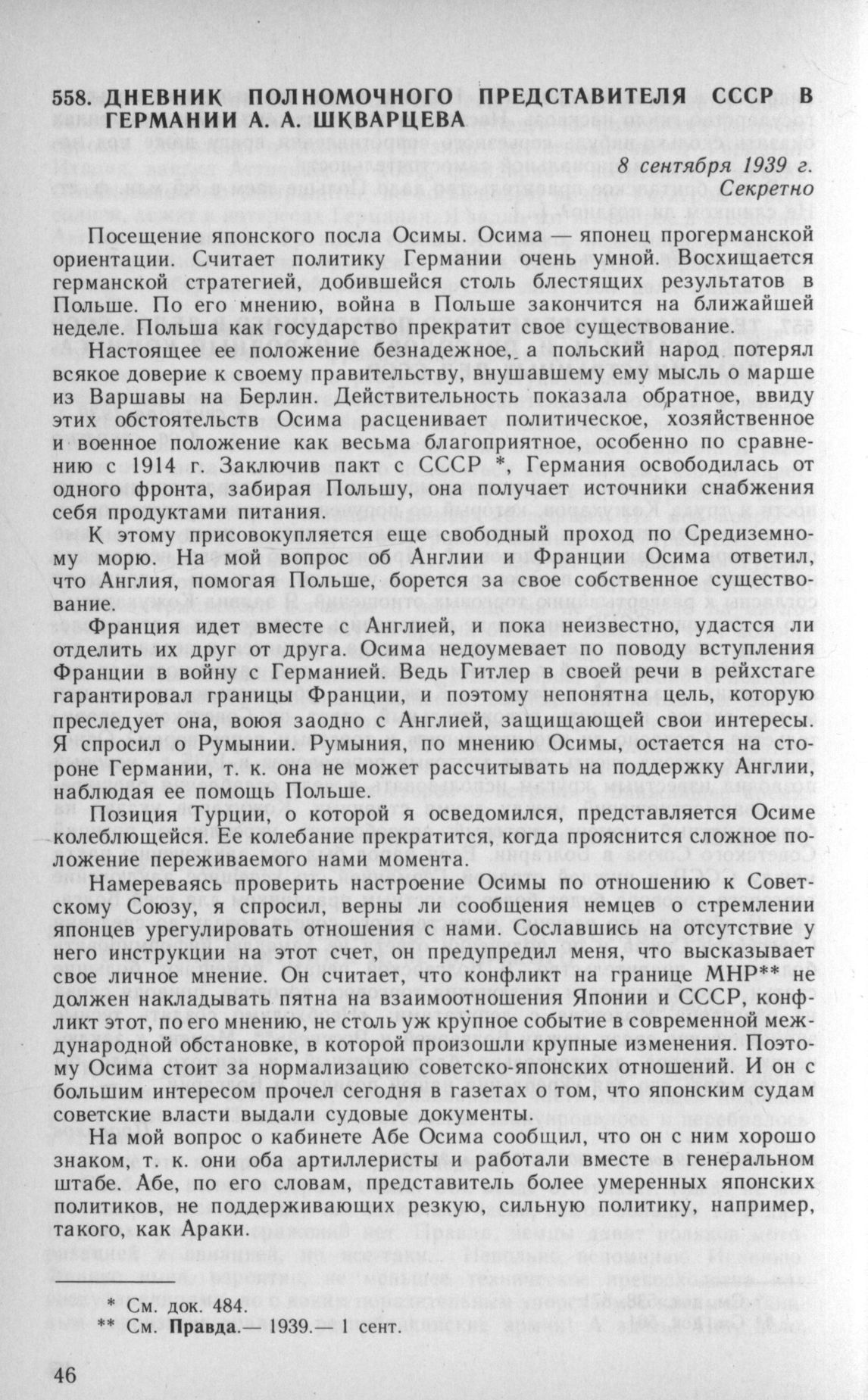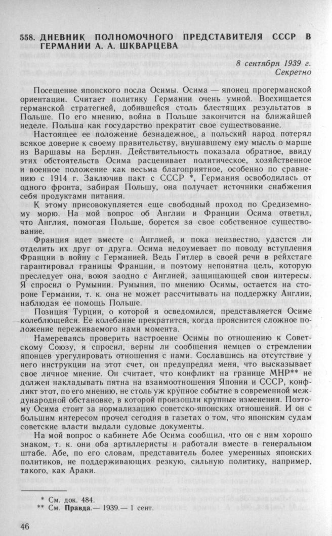 Дневник полномочного представителя СССР в Германии А. А. Шкварцева. 8 сентября 1939 г. // АВП РФ, ф. 011, oп. 4, п. 27, д. 60, л. 65—66.