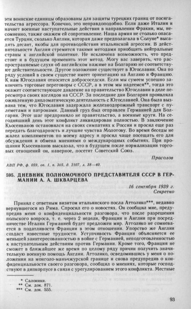 Дневник полномочного представителя СССР в Германии А. А. Шкварцева. 16 сентября 1939 г. // АВП РФ, ф. 011. oп. 4, п. 27, д. 60. л. 85—86.