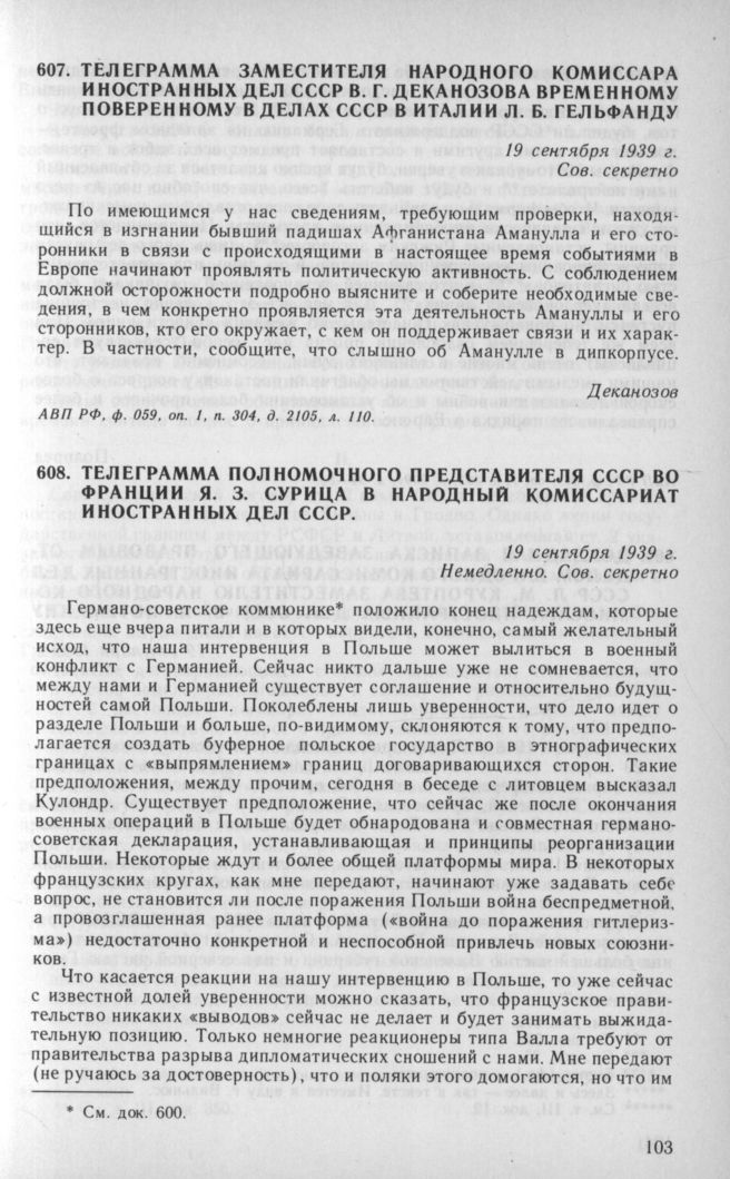 Телеграмма заместителя народного комиссара иностранных дел СССР В. Г. Деканозова временному поверенному в делах СССР в Италии Л. Б. Гельфанду. 19 сентября 1939 г. // АВП РФ, ф. 059, oп. 1, п. 304, д. 2105, л. 110.