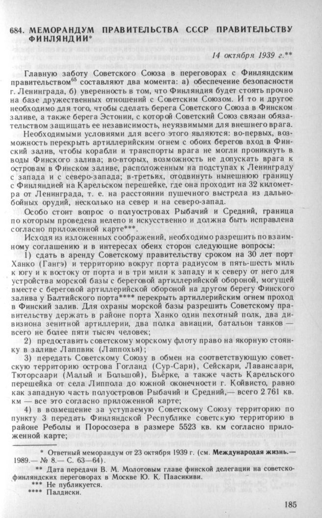 Меморандум Правительства СССР Правительству Финляндии. 14 октября 1939 г. // АВП РФ, ф. 06. oп. 1, п. 18, д. 191, л. 1—2.; Международная жизнь.— 1989.— № 8.— С. 62—63.
