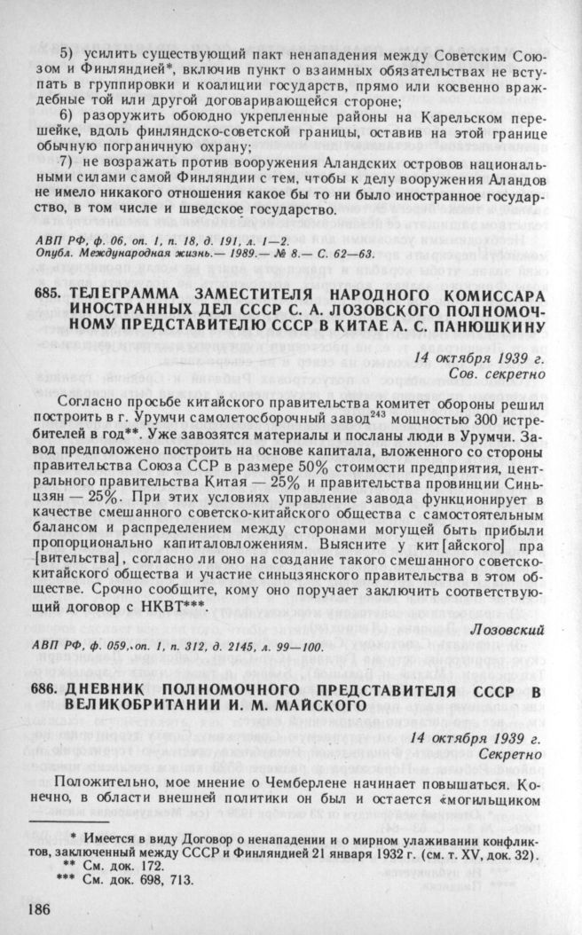 Телеграмма заместителя народного комиссара иностранных дел СССР С. А. Лозовского полномочному представителю СССР в Китае А. С. Панюшкину. 14 октября 1939 г. // АВП РФ, ф. 059, oп. 1, п. 312, д. 2145, л. 99—100.