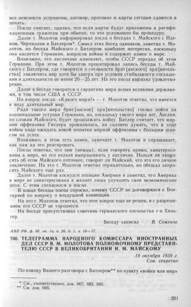 Телеграмма народного комиссара иностранных дел СССР В. М. Молотова полномочному представителю СССР в Великобритании И. М. Майскому. 19 октября 1939 г. // АВП РФ, ф. 059, oп. 1, п. 301, д. 2080, л. 96.