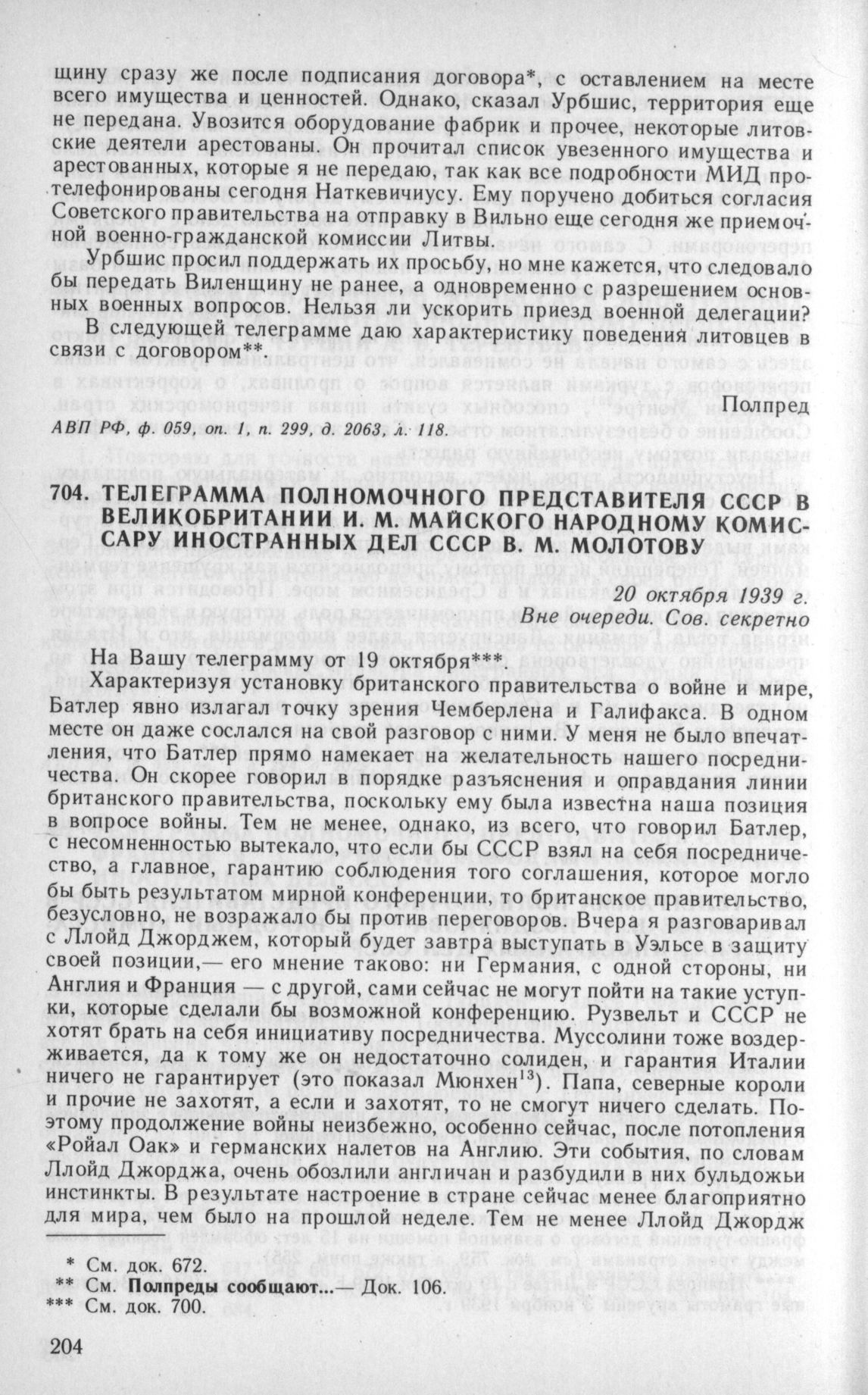 Телеграмма полномочного представителя СССР в Великобритании И. М. Майского народному комиссару иностранных дел СССР В. М. Молотову. 20 октября 1939 г. // АВП РФ, ф. 059, oп. 1, п. 300, д. 2078, л. 181—183.