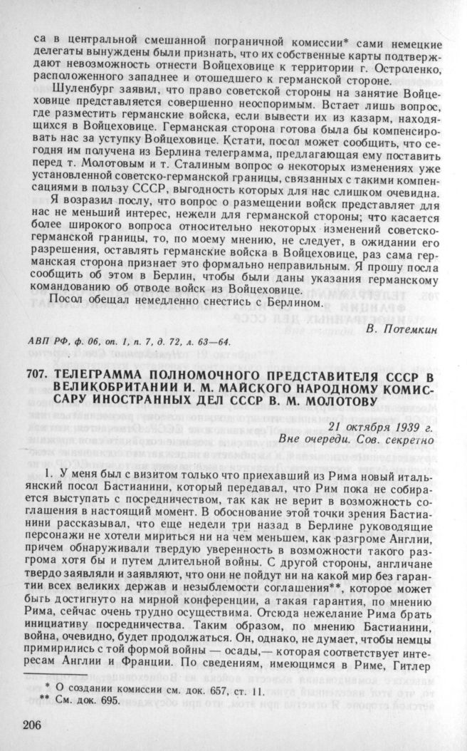 Телеграмма полномочного представителя СССР в Великобритании И. М. Майского народному комиссару иностранных дел СССР В. М. Молотову. 21 октября 1939 г. // АВП РФ, ф. 059. oп. 1. п. 300, д. 2078, л. 188—190.