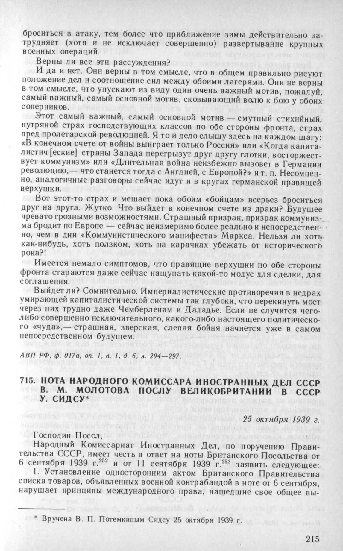 Нота народного комиссара иностранных дел СССР В. М. Молотова послу Великобритании в СССР У. Сидсу. 25 октября 1939 г. // Известия. 1939. 26 октября.