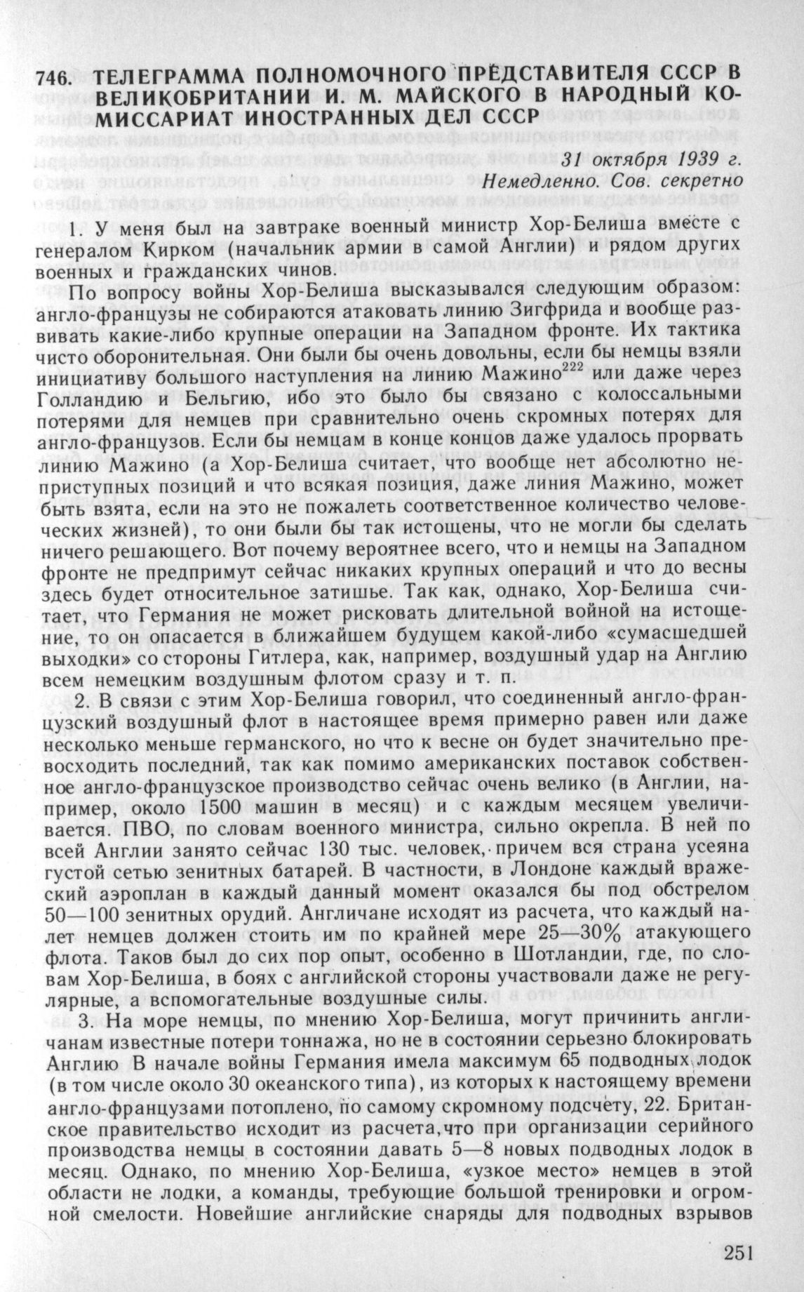 Телеграмма полномочного представителя СССР в Великобритании И. М. Майского в Народный комиссариат иностранных дел СССР. 31 октября 1939 г. // АВП РФ, ф. 059. oп. 1, п. 300. д. 2078, л. 229—232.
