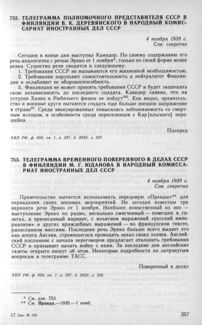 Телеграмма временного поверенного в делах СССР в Финляндии М. Г. Юданова в Народный комиссариат иностранных дел СССР. 4 ноября 1939 г. // АВП РФ, ф. 059, oп. 1, п. 297, д. 2053. л. 236.