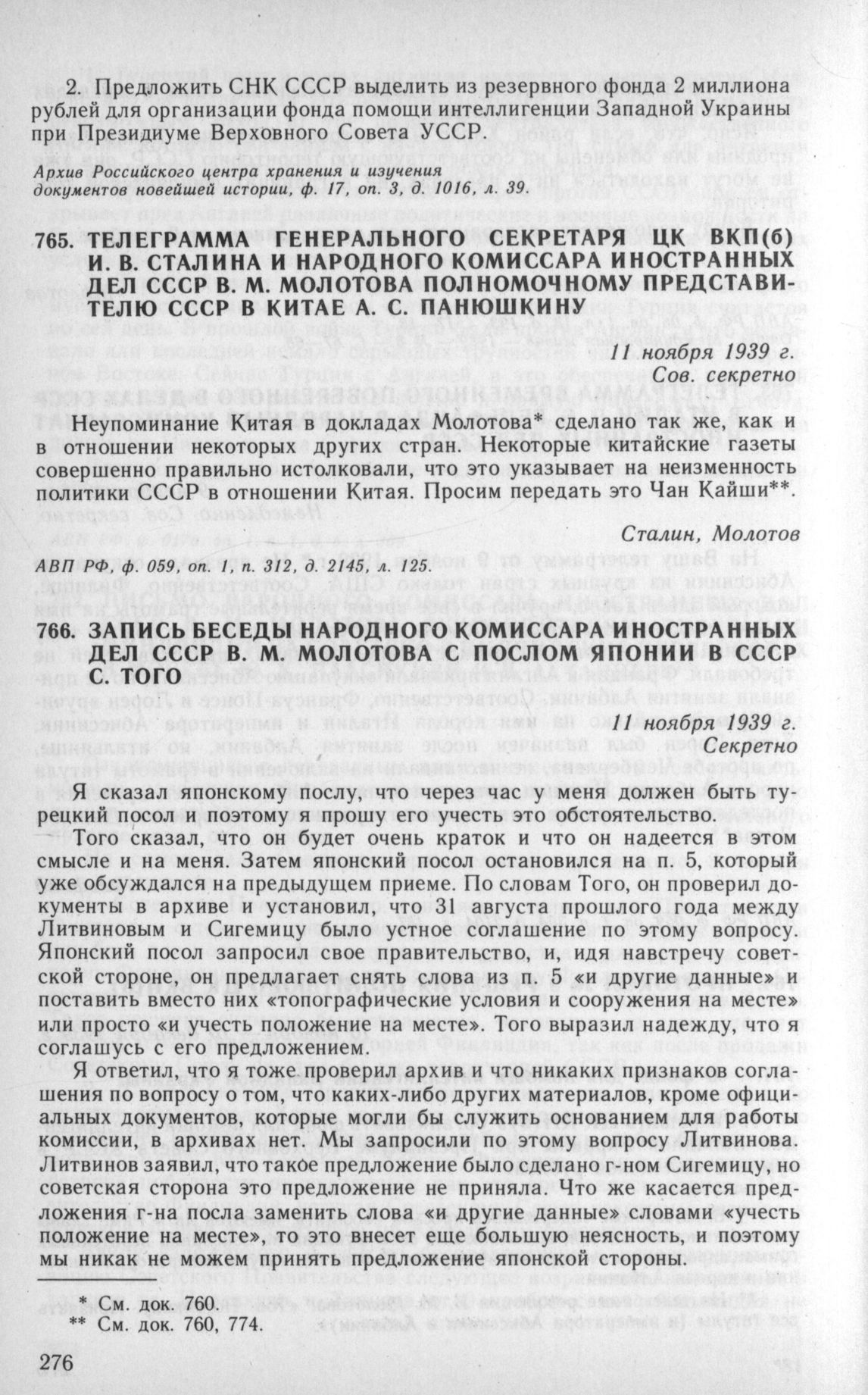 Запись беседы народного комиссара иностранных дел СССР В. М. Молотова с послом Японии в СССР С. Того. 11 ноября 1939 г. // АВП РФ, ф. 06, oп. 1, п. 1, д. 4, л. 30—33.