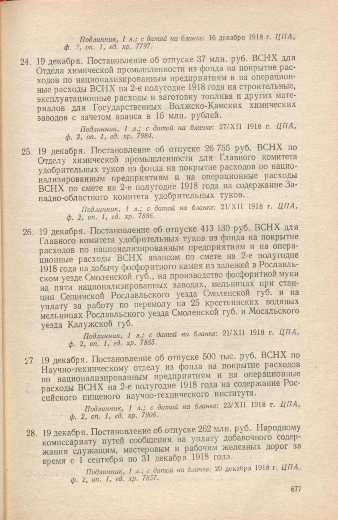 19 декабря. Постановление об отпуске 413 130 руб. ВСНХ для Главного комитета удобрительных туков из фонда на покрытие расходов по национализированным предприятиям и на операционные расходы ВСНХ авансом по смете на 2-е полугодие 1918 года на добычу фосфоритного камня из залежей в Рославльском уезде Смоленской губ., на производство фосфоритной муки на пяти национализированных заводах, мельницах при станции Сещинской Рославльского уезда Смоленской губ. и на уплату за работу по перемолу на 25 крестьянских водяных мельницах Рославльского уезда Смоленской губ. и Мосальского уезда Калужской губ. // Подлинник, 1 л.; с датой на бланке: 21/XII 1918 г. ЦПА, ф. 2, oп. 1, ед. хр. 7885.