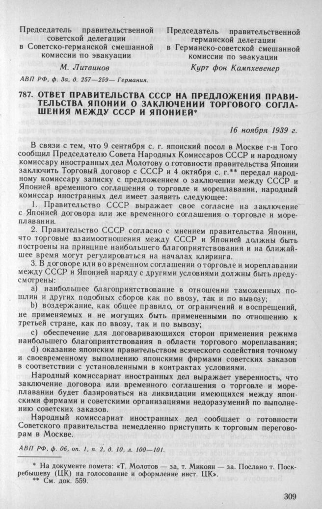 Ответ Правительства СССР на предложения Правительства Японии о заключении Торгового соглашения между СССР и Японией. 16 ноября 1939 г. // АВП РФ, ф. 06, oп. 1, п. 2, д. 10, л. 100—101.
