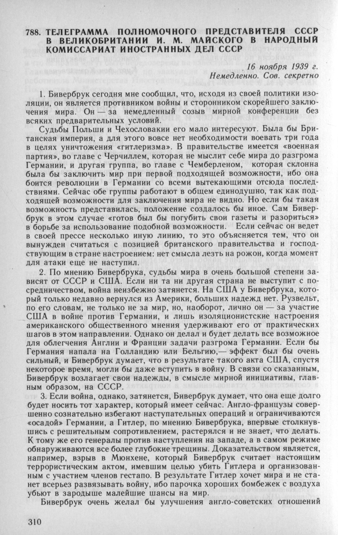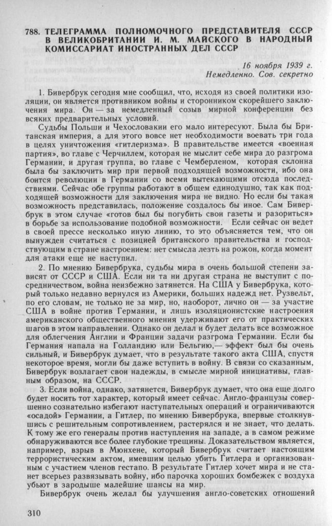 Телеграмма полномочного представителя СССР в Великобритании И. М. Майского в Народный комиссариат иностранных дел СССР. 16 ноября 1939 г. // АВП РФ, ф. 059, oп. 1, п. 300, д. 2073, л. 270—274.