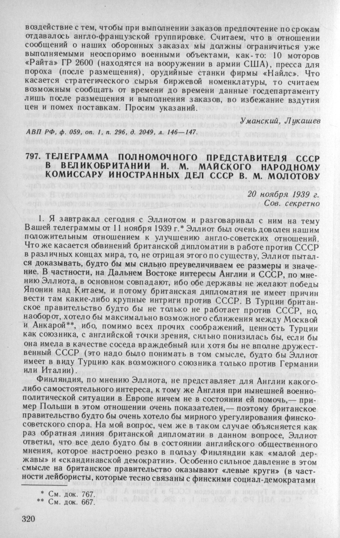 Телеграмма полномочного представителя СССР в Великобритании И. М. Майского народному комиссару иностранных дел СССР В. М. Молотову. 20 ноября 1939 г. // АВП РФ, ф. 059, oп. 1, п. 300. д. 2078. л. 284— 288.