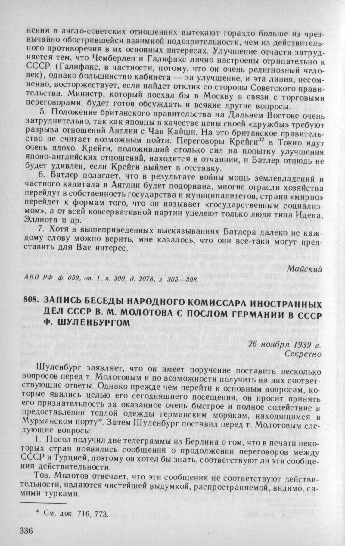 Запись беседы народного комиссара иностранных дел СССР В. М. Молотова с послом Германии в СССР Ф. Шуленбургом. 26 ноября 1939 г. // АВП РФ, ф. 06, oп. 1, п. 1, д. 4, л. 72—74.