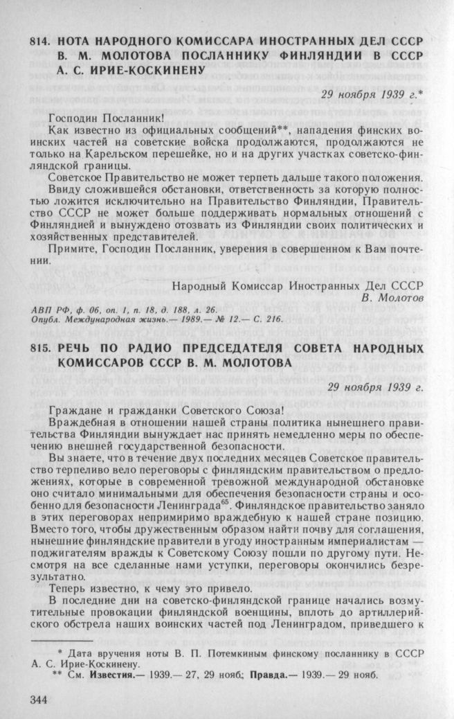 Нота народного комиссара иностранных дел СССР В. М. Молотова посланнику Финляндии в СССР А. С. Ирие-Коскинену. 29 ноября 1939 г. // АВП РФ, ф. 06, oп. 1, п. 18, д. 188, л. 26.; Международная жизнь.— 1989.— № 12.— С. 216.