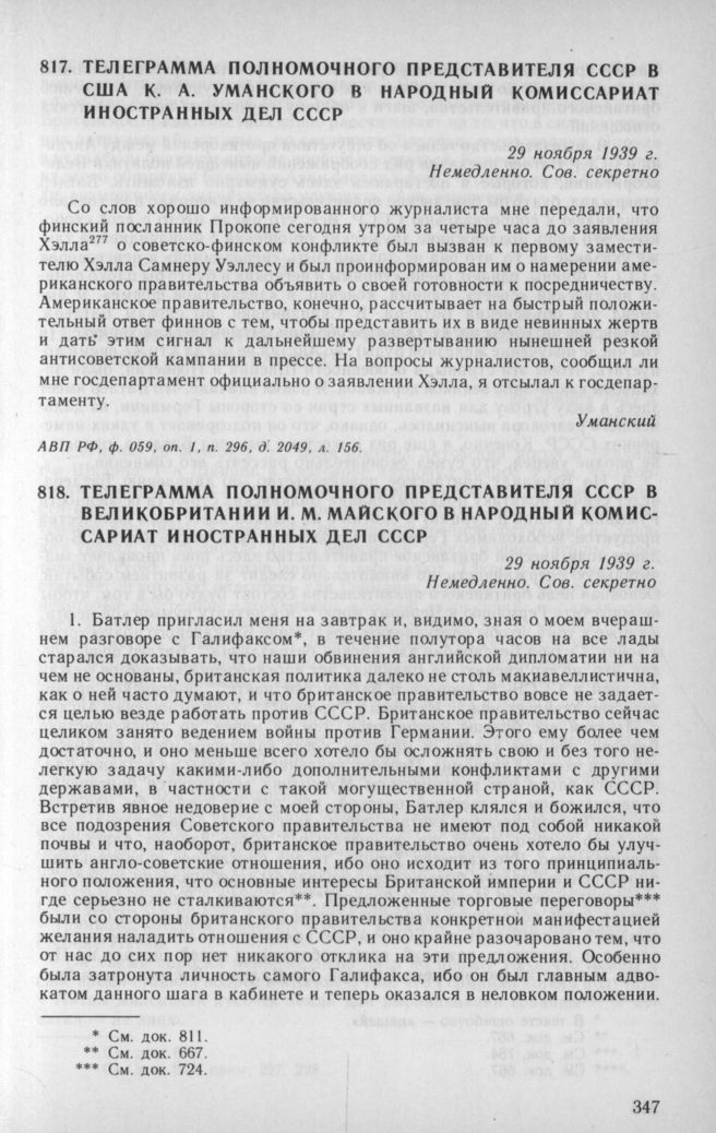 Телеграмма полномочного представителя СССР в Великобритании И. М. Майского в Народный комиссариат иностранных дел СССР. 29 ноября 1939 г. // АВП РФ, ф. 059, oп. 1, п. 300, д. 2078, л. 321—325.